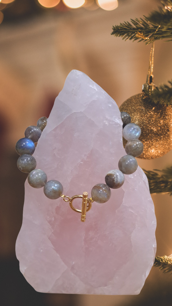 Ce bracelet est réalisé à partir de perle en labradorite 12mm et d’un fermoir acier inoxydable doré mat.